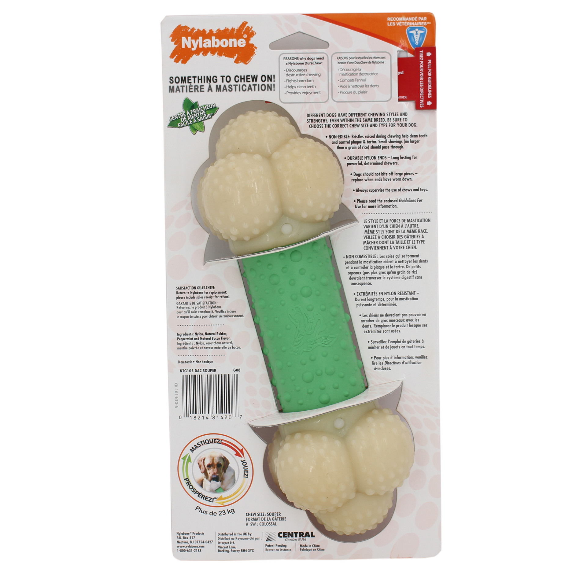 Nylabone ́s chewing bones are made from extra strong nylon and therefore are specially suitable for powerful chewers. The Double Action Chew is a chewing bone with ham flavor, which is deliciously appealing to your dog. The ends are made of the strong, durable nylon with ham aroma, while the middle piece is made of soft rubber. With each of the three different varieties, the middle piece has a size, which makes it easy to pick the right sizes for your dog. Not only does it bring variety when one judges by the outward appearance, it also offers change concerning the taste. It's minty taste corresponds well with it's positive influence on dental hygiene. While the regular chewing bone (ca. 13 cm / 5.1'') is best used by dogs up to 11kg, the wolf chewing bone (ca. 18 cm / 7.1'') is perfectly fine to be used by dogs up to 23kg. The souper chewing bone (ca. 24 cm / 9.5'') is designed for bigger dogs, starting at 23kg.