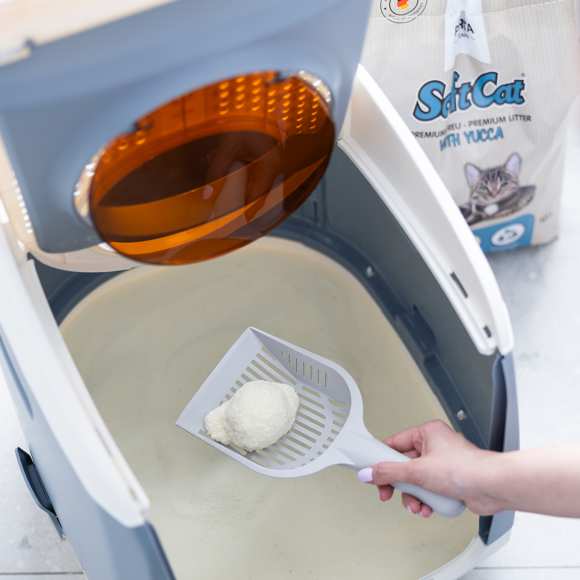 Cat Residence is very easy to clean due to its unique opening handle mechanism that allows to open the track matt and front door at the same time. The package includes an ergonomic cat litter scoop, which can be connected to the litter box.