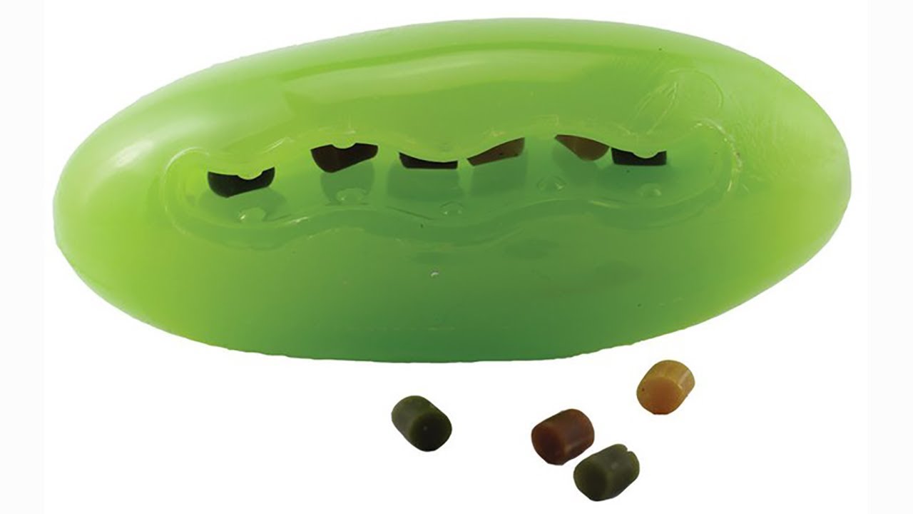 Der Treat Dispensing Pickle Pocket bietet Ihrem Hund Stunden des interaktiven Spiels. Auch zum Apportier-Training geeignet. Füllen Sie die Öffnungen und den Bauch mit Leckerlis oder auch Futter. Durch seine länglich runde Form springt der Treat Dispensing Pickle Pocket in willkürliche Richtungen. So bekommt der Hund viel Bewegung und aktives Training. Sehr haltbares Material, leichte Reinigung in der Spülmaschine.