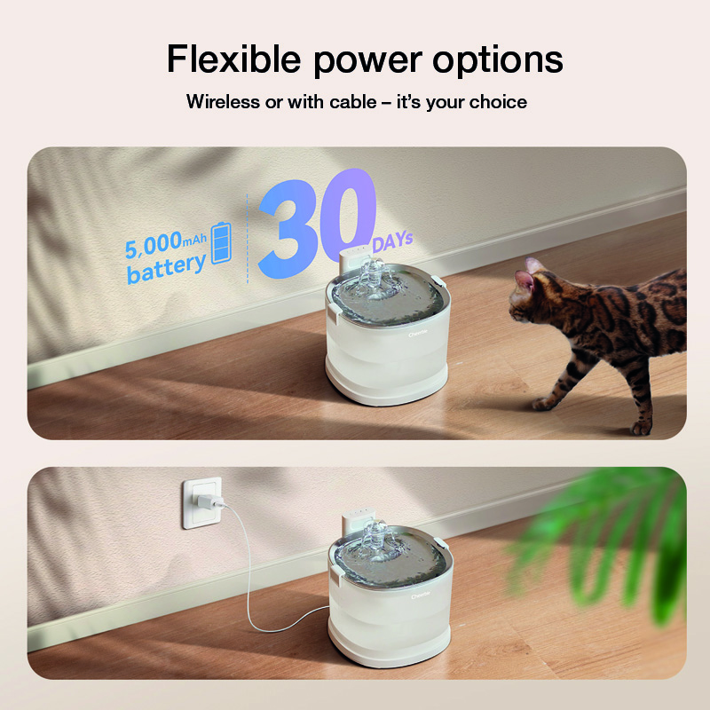 Mit einem leistungsstarken 5000 mAh Akku und 2 Litern Fassungsvermögen ermöglicht der kabellose Trinkbrunnen maximale Flexibilität, denn er kann überall dort platziert werden, wo Ihr Haustier am liebsten trinkt. Das elegante Design passt sich zudem jeder Umgebung perfekt an.