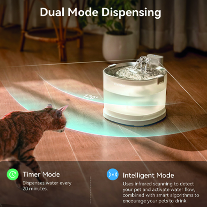 ✔ Zwei smarte Betriebsmodi – Sie haben die Wahl: Der Smart-Modus mit PIR-Sensor aktiviert sich bei Bewegung, sobald Ihre Katze oder Ihr Hund in der Nähe ist. Der Timer-Modus aktiviert den Wasserfluss alle 15 Minuten für 20 Sekunden.
